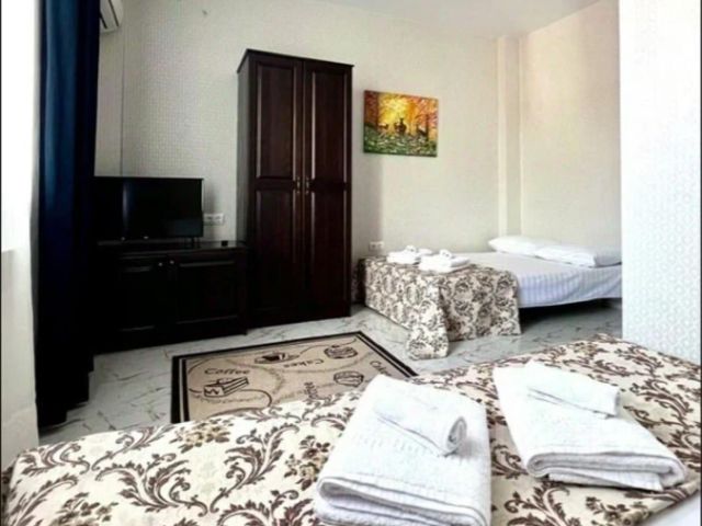 Номер со всеми удобствами и балконом. На территории кухня со всем необходимым оборудованием, мангальная зона, двор с экзотическими цветами. На каждом этаже пурифайер с холодной и горячей питьевой водой. Рядом море(450 метров), торговый центр(30 метров), базар(30 метров), магазины(50 метров), кафе. Хорошая транспортная доступность. Вам будут предложены разнообразные экскурсии, прокат велосипедов. Открыто бронирование на лето, цена соответствует. Заезд после 14.00., выезд до 12.00. Работаем с 8.00. до 23.00. Ждём Вас!