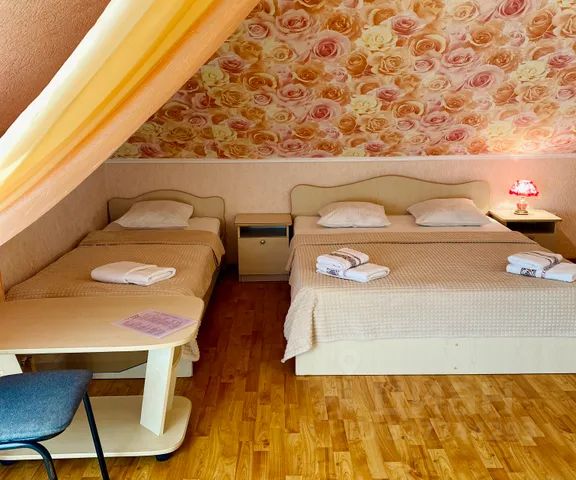 Есть два номера с разными конфигурациями: 1) двуспальная и полуторная кровати. 2) три полуторные кровати (сан. узел с ванной). Также номер оснащен: прикроватные тумбочки, шкаф для белья, небольшой телевизор, кондиционер, чайник, холодильник, фен. На балконе стол, стулья и сушилка для белья. Сан. узел в номере. Комплект полотенец (2 на гостя). Уборка номеров и смена полотенец происходит через 3 дня или по требованию гостя. Смена постельного белья через 5 дней отдыха. Что у нас есть: Автостоянка: бесплатная перед домом; Бассейн: с подогревом (режим работы 9:0022:00); Прачечная: услуга постирки 300 руб.; Место для отдыха во дворе; Интернет в номерах: плюс на территории; Кафе: блюда на мангале; европейская кухня (ориентировочное начало работы с ~01.07); Столовая: завтрак "шведский стол" (в стоимость не входит, возможно, будет запущено с ~01.0731.08); Бар: холодные и горячие напитки, кофе, коктейли; Мини-кухня: во внутреннем дворике, небольшая для приготовления лёгких блюд (2 газовые конфорки).