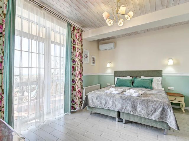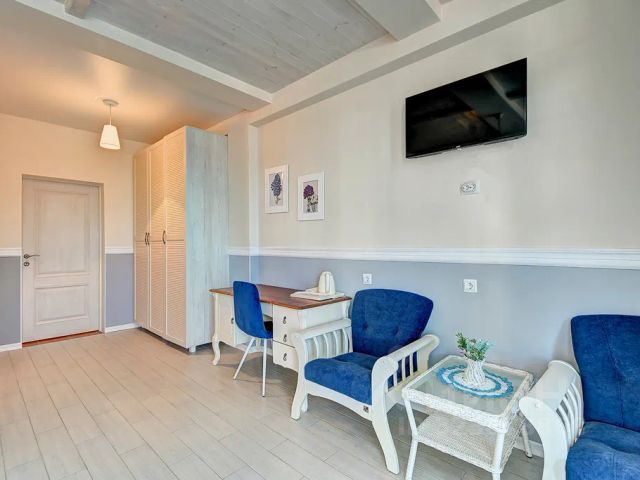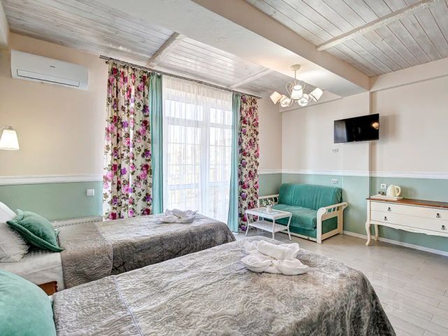 Просторный светлый двухкомнатный номер. В каждой из комнат номера наши дизайнеры создали эстетически безупречный интерьер, выдержанный в спокойных, мягких тонах. Удобная двуспальная кровать подарит Вам мирный и здоровый сон. Предусмотрено 1 дополнительное спальное место*. В номере есть всё для безмятежного отдыха: кондиционер, плазменные телевизоры, Яндекс станция "Алиса", бесплатный Wi-Fi, холодильник и микроволновая печь, обеденный стол на несколько персон, кухонный уголок, столы, стулья, кресла, диван. Многоуровневое освещение привносит в номер уют. Индивидуальный санузел оборудован современной душевой кабиной.