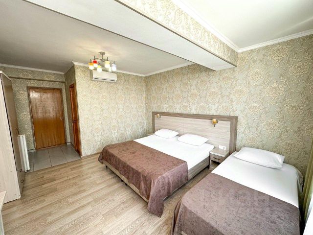 Трёхместный номер 22 кв.м. Подходит для размещения 4 человек. (2 основных места и 2 дополнительных) Имеет спальню с приятным интерьером. В номере: 1 двуспальная кровать, 1 двуспальный диван. Имеется телевизор, кондиционер, шкаф, вешалка, зеркало, журнальный столик, обеденный стол, рабочий стол, холодильник, чайник, стулья. Индивидуальная ванная комната: душ, раковина, туалет. В стоимость входит: Постельное бельё, полотенца, мыло. WI-Fi бесплатно на всей территории. Бесплатная общественная парковка за территорией.