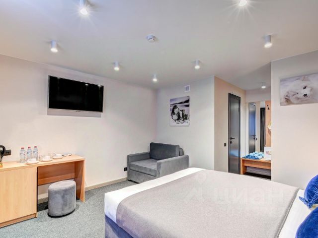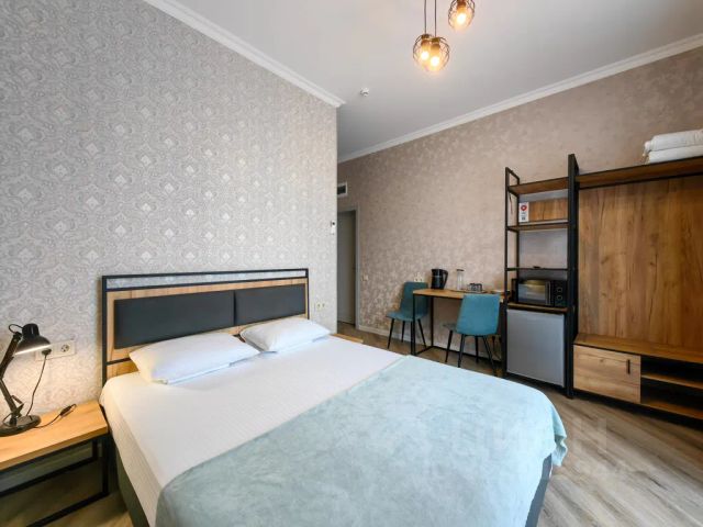 Однокомнатный номер оформлен в современном стиле, интерьер выполнен в светлых тонах и со всем необходимым оборудованием для комфортного пребывания гостей. В номере удобная двуспальная кровать, Smart TV, холодильник.