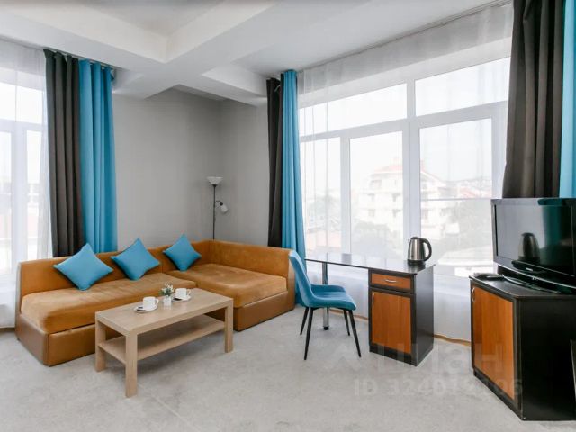 Студия с видом на горы (29.3кв.м) на 4 гостей - однокомнатный номер и Совмещенный санузел с ванной, фен, гигиенические средства, косметические средства, полотенца, халат, тапочки; сушилка для белья). В номере кровати 2 полутороспальные кровати , угловой диван, ТВ, мини-холодильник, сейф, , Wi-Fi, чайник. Вид-на горы/на море.