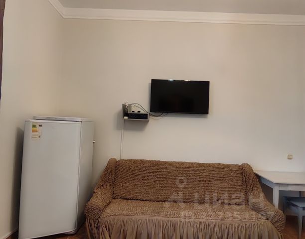 Описание комнаты Комната небольшая и светлая, выполнена в спокойных бежевых и коричневых тонах. Основная мебель — длинный диван бежевого цвета с черными подлокотниками. На противоположной стене крепится плоский телевизор. Также есть кондиционер. В глубине комнаты есть арочный проем, там располагается мини кухня со столом, холодильником и микроволновой печью. Есть необходимая посуда. Слева на стене установлен кондиционер, а справа отражается зеркальная поверхность дверей шкафа-купе, добавляющая ощущение пространства. Комната выглядит функциональной, аккуратной, с минималистичным дизайном, ориентированным на комфорт и уют. Аренда жилья в Сочи.