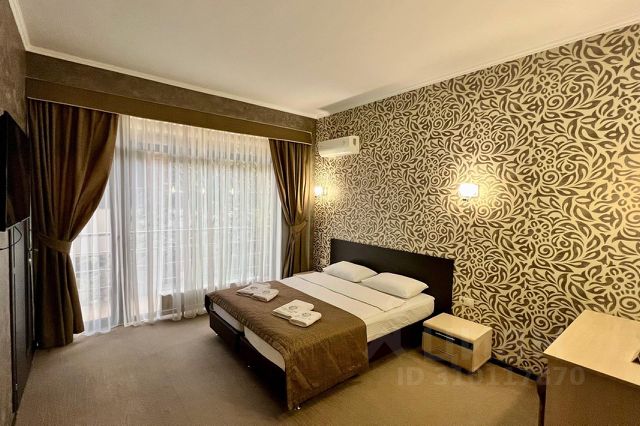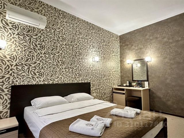 Номер Делюкс с двуспальной кроватью, диваном и балконом. С балкона номера открывается лучший в отеле вид на море. Размер спальных мест в номере: двуспальная кровать 1,6 на 2,0 м, диван в разложенном виде 1,3 на 2,0 м. Площадь номера 25 квадратных метров.