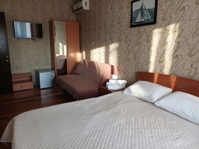 Номер оснащен кондиционером, ТВ, Wi-Fi на всей территории. Имеется летняя кухня-беседка с необходимым оснащением для самостоятельного приготовления пищи. Рядом столовая. магазин. Утюг и гладильная доска в наличии. Мангальная зона. Заселение с животным маленьких пород. Туалет, душ общие. Гостевой дом всего в 10 минутах от моря.
