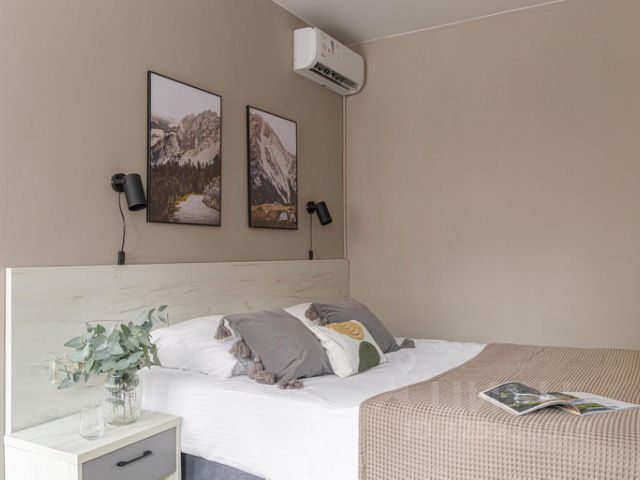 Отель в центре поселка Красная Поляна, на высоте 550 метров над уровнем моря, у подножья горы Аибга. На расстоянии 6 км располагается "Главная канатная дорога Курорта Красная Поляна", в 8 км канатные дороги "Лаура" и "Альпика" горно-туристического центра "Газпром", в 9 км канатная дорога "Олимпия" горнолыжного комплекса "Роза Хутор". В 7 минутах ходьбы от отеля автобусная остановка "Вертодром". Расстояние до ж/д станции "Роза Хутор" 8 км, до аэропорта Сочи 41 км. Для бронирования доступны номера категорий Стандарт, Семейный, Комфорт. Каждый из них оснащен телевизором с кабельными каналами, кондиционером, холодильником, шкафом. Собственные ванные комнаты оборудованы душевой кабиной. Предоставляются туалетно-косметические принадлежности. Есть номера с балконом. Отель отлично подойдет для любителей активного отдыха, так как здесь есть прокат горнолыжного снаряжения, оборудована комната для хранения и сушки лыжного инвентаря. В зимний сезон организуется трансфер до подъемников. После катания гости могут отдохнуть в сауне. В летний сезон работает прокат велосипедов. Для детей во дворе оборудована игровая площадка. 2-х местный 1-но комнатный Номера в стиле лофт с отделкой из натурального дерева . вид на горы\вид во внутренний двор (без балкона) 1 этаж, 2 отдельные кровати.