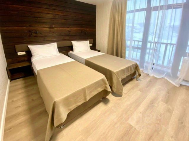 Отель в центре поселка Красная Поляна, на высоте 550 метров над уровнем моря, у подножья горы Аибга. На расстоянии 6 км располагается "Главная канатная дорога Курорта Красная Поляна", в 8 км канатные дороги "Лаура" и "Альпика" горно-туристического центра "Газпром", в 9 км канатная дорога "Олимпия" горнолыжного комплекса "Роза Хутор". В 7 минутах ходьбы от отеля автобусная остановка "Вертодром". Расстояние до ж/д станции "Роза Хутор" 8 км, до аэропорта Сочи 41 км. Для бронирования доступны номера категорий Стандарт, Семейный, Комфорт. Каждый из них оснащен телевизором с кабельными каналами, кондиционером, холодильником, шкафом. Собственные ванные комнаты оборудованы душевой кабиной. Предоставляются туалетно-косметические принадлежности. Есть номера с балконом. Отель отлично подойдет для любителей активного отдыха, так как здесь есть прокат горнолыжного снаряжения, оборудована комната для хранения и сушки лыжного инвентаря. В зимний сезон организуется трансфер до подъемников. После катания гости могут отдохнуть в сауне. В летний сезон работает прокат велосипедов. Для детей во дворе оборудована игровая площадка. 2-х местный 1-но комнатный Номера в стиле лофт с отделкой из натурального дерева . вид на горы\вид во внутренний двор, балкон. 2 этаж, 2 отдельные кровати.