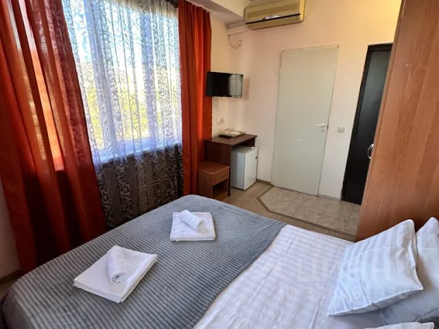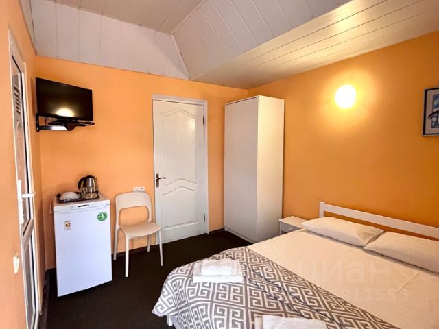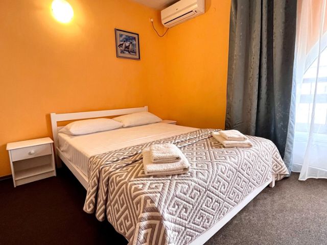Звонки по телефону возможны только с 09:00 по 22:00 по московскому времени. Не звоните ночью, пожалуйста. Спасибо за понимание! Минимальное бронирование от двух суток. Работаем с мая по октябрь. Апартаменты на 4-м этаже с двуспальной кроватью в ГД Юг. Есть возможность разместить детскую кроватку или раскладушку. 50 метров от моря, первая береговая линия Вмещает до 3 человек Апартаменты состоят из 1 комнаты. Собственный санузел с душем. Кухни нет, имеется посуда для приема пищи, чайник, холодильник. Есть возможность доп. места для 3-го человека в виде еврораскладушки с ламелями. Предоставляем постельное белье, полотенца. Детская кроватка предоставляется по требованию. Размещение с животными возможно по запросу за доп плату в зависимости от вида и породы животного (с бойцовскими породами собак не принимаем) Часто задаваемые вопросы: Общей кухни нет, номеров с кухней нет, микроволновки нет, возможности для приготовления и разогрева пищи не предусмотрено. Мангальной зоны, бассейна и территории у гостевого дома нет Парковочных мест не предусмотрено. Можем предложить варианты платные парковок в непосредственной близости. Трансфера с жд вокзала/аэропорта не предусмотрено.