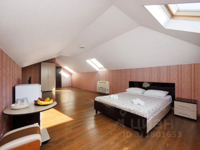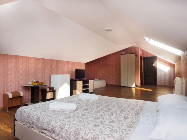 Комфортабельный большой номер для семьи до 5 человек, 5 этаж мансарда, две двуспальные кровати, для дополнительных мест предлагаем комфортные кровати-раскладушки. Оснащение: тв, кондиционер, холодильник, шкаф, зеркало, стол, стулья, тумбочки, собственный с/у, интернет, фен по запросу. Бассейн на территории отеля работает в летний период.