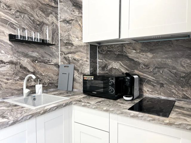 кухонная зона со всем необходимым: варочная поверхность, электрический и заварочный чайник, микроволновка, капсульная кофемашина, мини-холодильник, вся необходимая посуда и кухонная утварь;