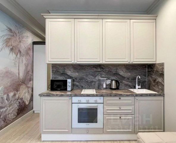 Кухня укомплектована всей необходимой техникой: от плиты до посуды — всё, чтобы почувствовать себя как дома.