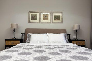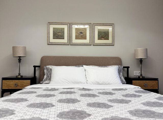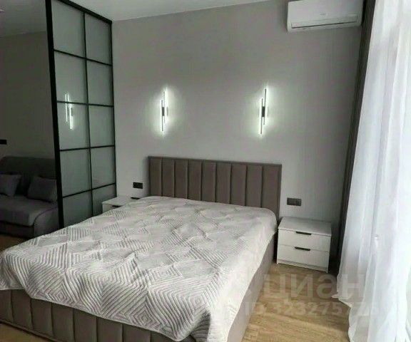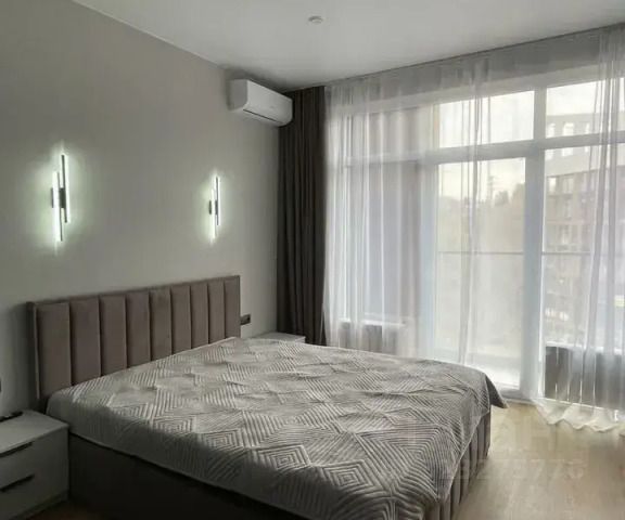 Спальня 1: двуспальная кровать, тумбочки, шкаф, кондиционер, выход на балкон.