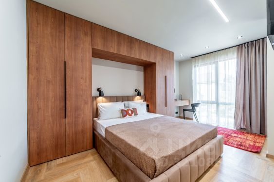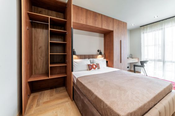 — спальня с двуспальной кроватью и ортопедическим матрасом 160 см., двумя большими вместительными шкафами для одежды, в которых на нижнем ярусе предусмотрено два места для чемоданов, туалетным/письменным столом и ТВ;