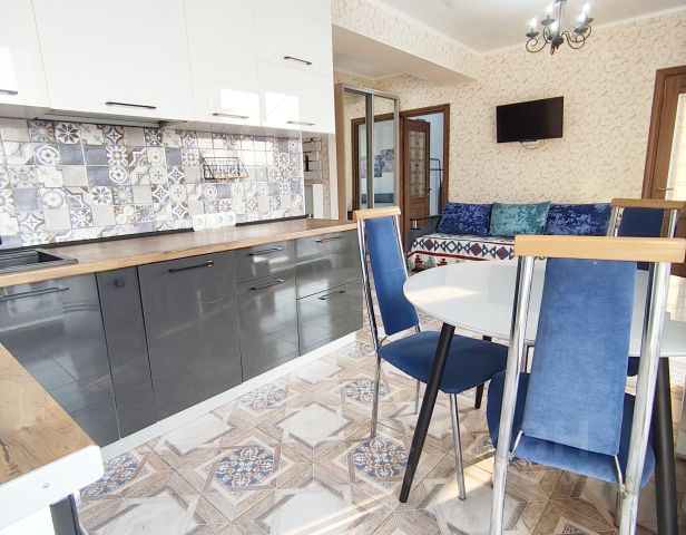 кухня-гостиная с удобным диваном и телевизором Samsung;