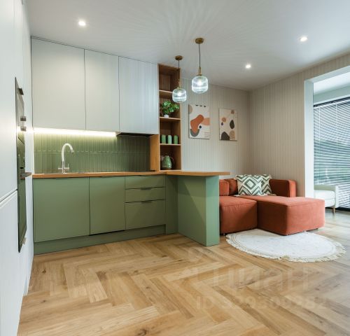- Полностью оборудованная кухонная зона с кухонным гарнитуром, посудой и раковиной,