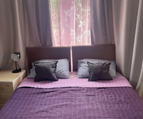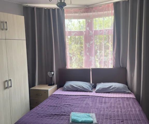В комнате двухспальная кровать с ортопедическим матрасом + двухспальный раскладной диван, платяной шкаф для одежды, раскладной стол-тумба, на лоджии односпальная кровать. Предоставляем постельное белье, полотенца.