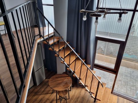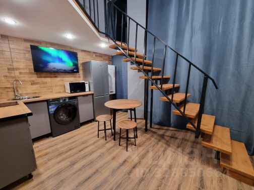 Loft studio площадью 27 м2 состоит из комнаты на 3 спальных места, совмещенной с кухонной зоной, и санузла с душевой кабиной. Санузел оборудован водонагревателем.