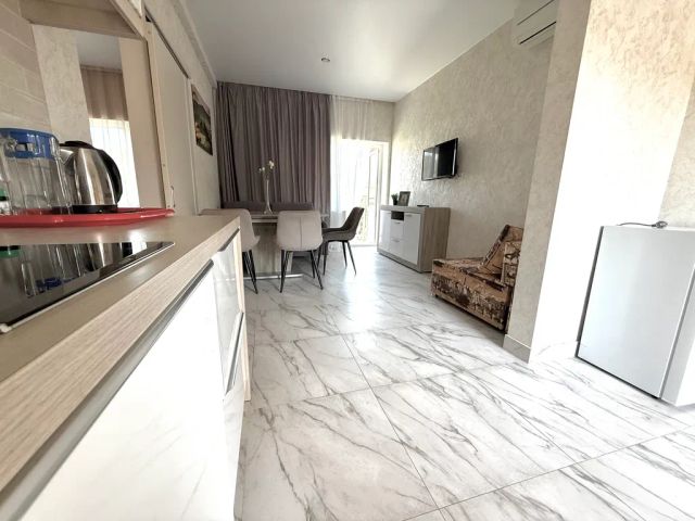 Сдаётся уютная студия с современным ремонтом в ЖК бизнес-класса! Жилой комплекс расположен в экологически чистом районе. На территории расположены 2 бассейна: взрослый и детский. Для детей есть большая детская площадка! Море в 7 минутах ходьбы по ровной местности. Рядом множество кафе, столовых, магазинов. До ж/д станции 10 минут, откуда вы можете попасть на электричку "Ласточка" и добраться до Сочи за 30 мин; Адлера за 40 мин; Олимпийского парка 50 мин; Красной Поляны 14:30 мин. До центра Сочи на авто 25-35 минут. В квартире есть всё необходимое для комфортного проживания! большая двуспальная кровать и раскладное кресло-кровать кухня, плита, вытяжка, холодильник, микроволновая печь, посуда, чайник, кухонные принадлежности. стиральная машина бойлер кондиционер Wi-Fi, Smart TV тропический душ фен гладильная доска, утюг белое постельное бельё белые полотенца шампунь, бальзам, гель для душа, одноразовые зубные щетки с пастой. Ранний заезд и поздний выезд обсуждаются индивидуально. Уборка помещений проводится перед каждым заселением.