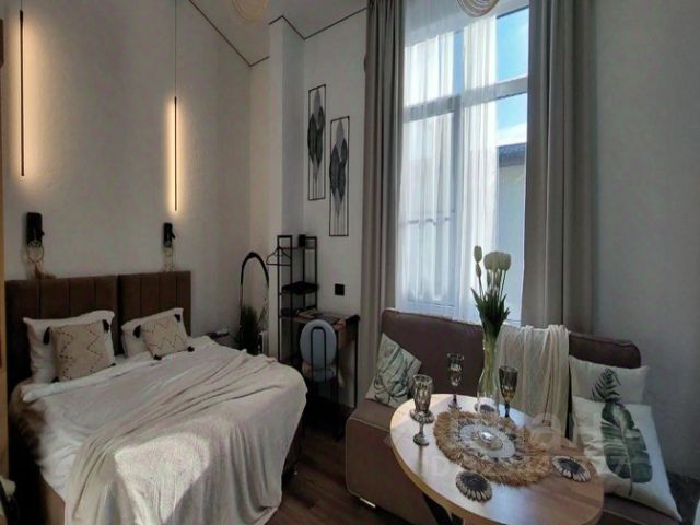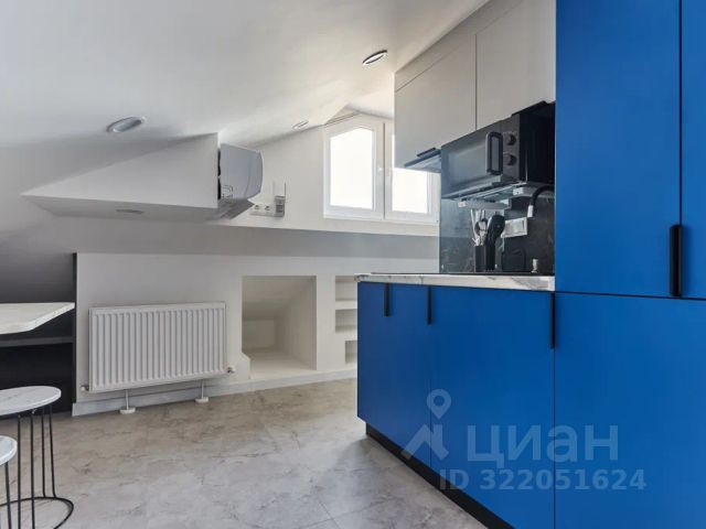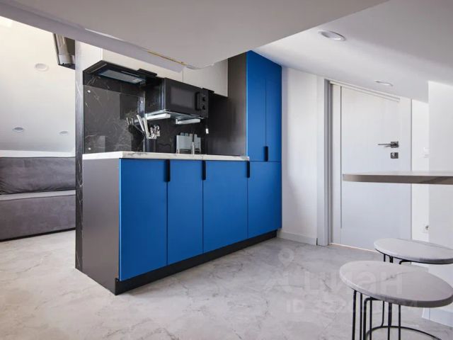 Квартира-студия выполнена в двух уровнях. На первом этаже располагается кухня-гостиная, приватная зона отдыха с удобным креслом, ванная комната с тропическим душем, шкаф-купе. Основные спальные места- кровать (160х200) и раскладной диван(140х200).