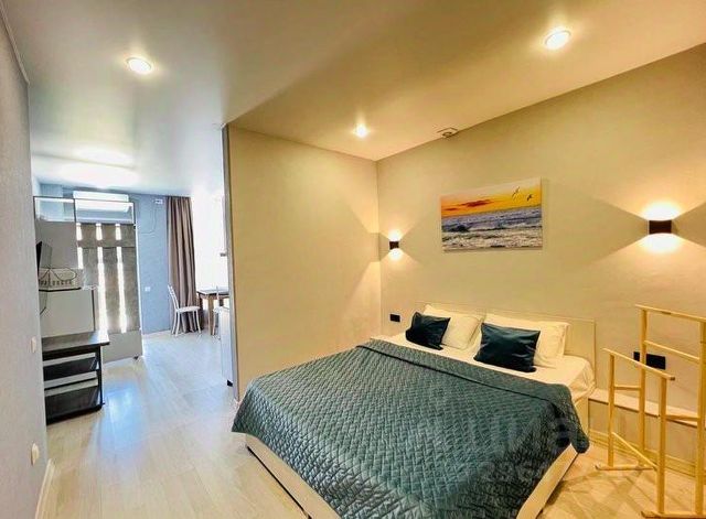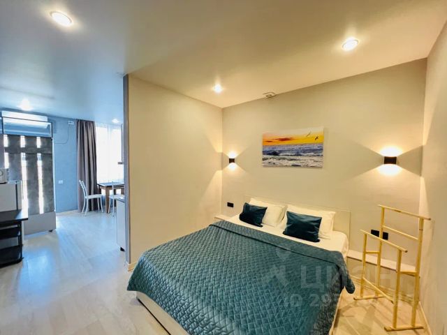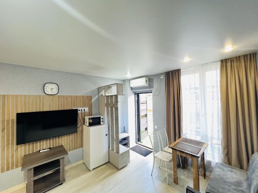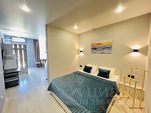 Общая площадь 19 кв.м., с балконом, выходящим во двор. Дом новый, сдан в 2019 году. Косметический ремонт в квартире сделан в мае 2024 года, все новое и свежее. Все необходимое для комфортного проживания троих человек имеется: удобная кухня со всей техникой, обеденная зона, двуспальный диван - кровать и кресло - кровать на одного человека . Смарт телевизор, микроволновка, стиральная машинка, утюг, гладильная доска, Wi-Fi, электрические тёплые полы, кондиционер, бойлер, бесплатная парковка.