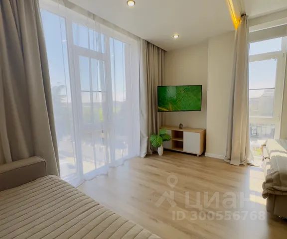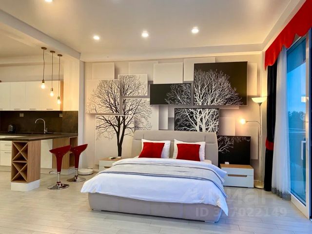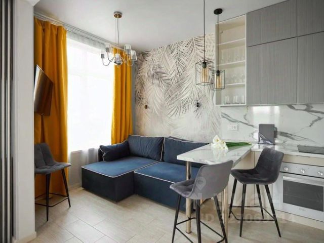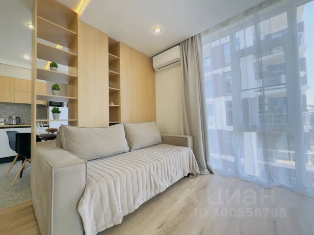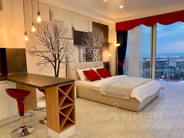 Стильная студия с зонированой спальней, кухней гостиной и балконом.