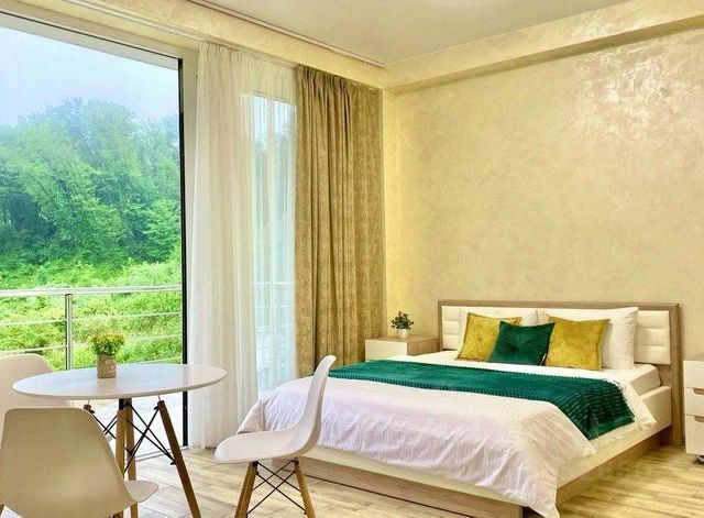 Кухня-студия с кроватью 160 х 200 см. Отдельная спальня с кроватью 160 х 200 см. Ванна с функцией гидромассажа (ванна ДЖАКУЗИ). Полноценная кухонная зона со всем необходимым для приготовления и сервировки.