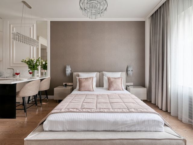 В спальне окунитесь в незабываемый сон, окружённой стеклянными перегородками и плотными шторами,которые создают атмосферу полного уединения