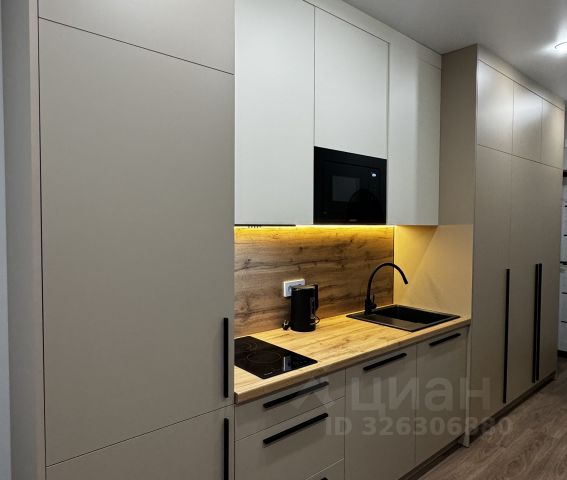 3. Выделенная обеденная зона с барной стойкой и барными стульями. Оборудованная кухня в современном стиле: встраиваемый холодильник, встраиваемая варочная панель, встраиваемая вытяжка, встраиваемая микроволновая печь, чайник, посуда для приготовления, столовая посуда и приборы, кухонные принадлежности.