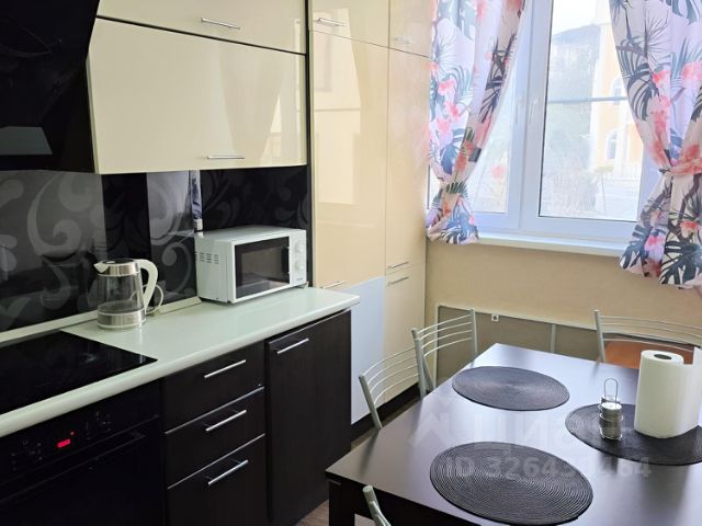 3. Выделенная обеденная зона. Оборудованная кухня в современном стиле: встраиваемый холодильник, встраиваемая варочная панель, встраиваемая вытяжка, микроволновая печь, чайник, посуда для приготовления, столовая посуда и приборы, кухонные принадлежности.