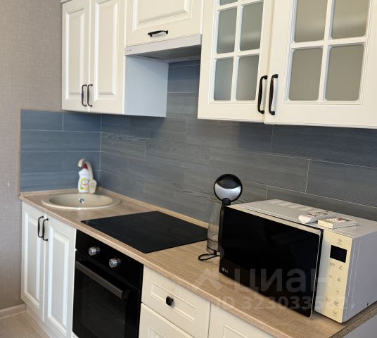 3. Выделенная обеденная зона. Оборудованная кухня в современном стиле: холодильник, встраиваемая варочная панель, вытяжка, микроволновая печь, чайник, посуда для приготовления, столовая посуда и приборы, кухонные принадлежности.