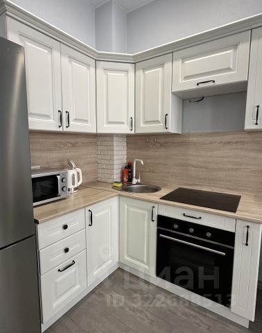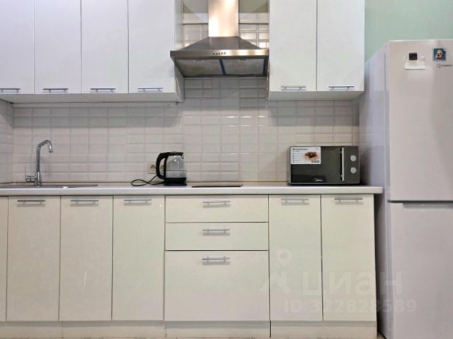 3. Выделенная обеденная зона. Оборудованная кухня в современном стиле: холодильник, встраиваемая варочная панель, вытяжка, микроволновая печь, чайник, посуда для приготовления, столовая посуда и приборы, кухонные принадлежности.