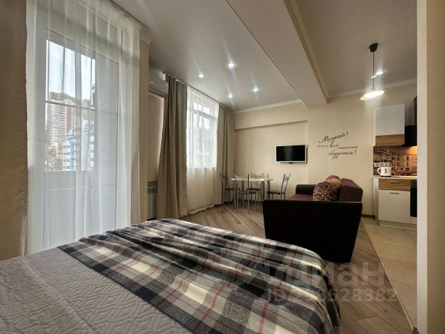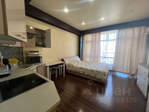 Сдается уютная студия в новом комплексе бизнес- класса ЖК Море Студия 17 квадратов на видовом 10-м этаже. В квартире удобная двуспальная кровать, встроенная кухня, двухкамерный полноценный холодильник, встроенный шкаф, душевая кабина, стиральная машина, варочная панель и микроволновая печь, телевизор. На территории комплекса детские и спортивные площадки, круглогодичный бассейн с подогревом. Оживленное место, рядом продуктовые магазины, аптека, остановка общественного транспорта. До моря 15-20 минут пешком по приятной оборудованной набережной реки Псахе. Заключаем договор аренды. Залог и первый месяц. 35 тысяч октябрь- май июнь- сентябрь 50 тысяч рублей.