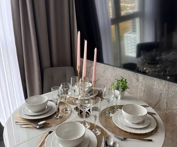 Вместимость до 4 гостей: просторная однокомнатная квартира с раскладным диваном и двуспальной кроватью, совмещённый санузел с ванной, панорамные окна