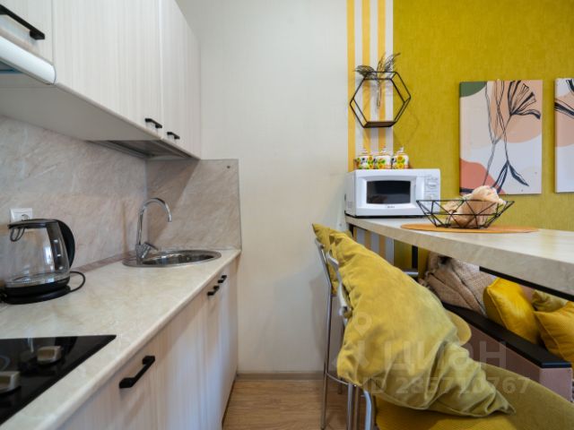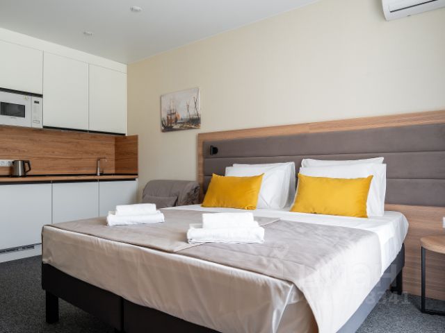 Кухонная зона оснащена электроплитой, электрочайником, холодильником, микроволновкой, столовыми приборами и посудой, столом и стульями, что сэкономит ваш бюджет на еде в столовых и кафе