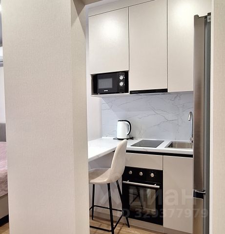 3. Выделенная обеденная зона с барной стойкой и барными стульями. Оборудованная кухня в современном стиле: холодильник, встраиваемая варочная панель, вытяжка, микроволновая печь, чайник, посуда для приготовления, столовая посуда и приборы, кухонные принадлежности.