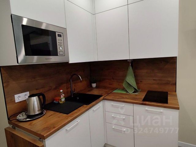 3. Выделенная обеденная зона с барной стойкой и барными стульями. Оборудованная кухня в современном стиле: встраиваемый холодильник, встраиваемая варочная панель, встраиваемая вытяжка, встраиваемая микроволновая печь, чайник, посуда для приготовления, столовая посуда и приборы, кухонные принадлежности.