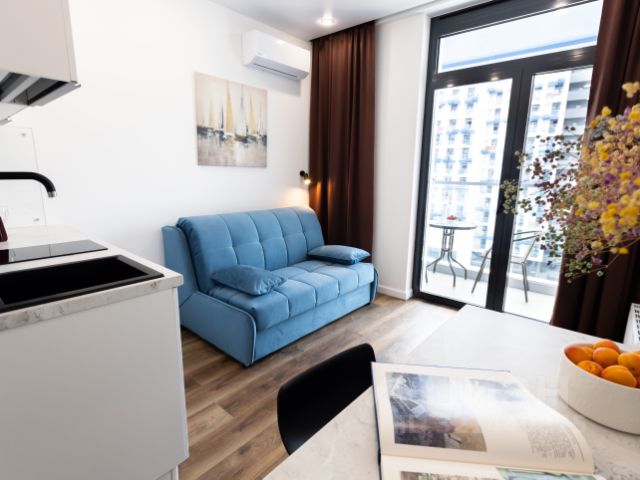 Эта новая квартира-студия с балконом! Сдается на длительный срок-до лета (май включительно). При аренде на иной срок, цена устанавливается индивидуально по договорённости. БЕЗ КОМИССИИ! ЖК бизнес-класса Кислород удобно расположился в новом районе Сочи, откуда открываются великолепные пейзажи в обе стороны на море, горы и окрестности города. Данная квартира предназначена для ценителей комфорта, уюта и эргономики. Все детально продумано и укомплектовано: 1. Огромная двуспальная кровать с ортопедическим матрасом - для лучшего сна или просмотра любимого фильма; концентрированная рабочая зона для творческого или рабочего созидания; вместительный шкаф для вещей и одежды. 2. Балкон с захватывающим и великолепным видом, столик и стулья - позволят созерцать прелесть и величие гор главного кавказского хребта с высоты "птичьего полёта". 3. Выделенная обеденная зона с барной стойкой и стульями. Оборудованная кухня в современном стиле: встраиваемый холодильник, встраиваемый духовой шкаф, встраиваемая варочная панель, встраиваемая вытяжка, встраиваемая микроволновая печь, чайник, посуда для приготовления, столовая посуда и приборы, кухонные принадлежности. 4. Современная техника и электроника: ЖК-телевизор с голосовым помощником Сбер, быстрый стабильный WIFI, сплит-система, стиральная машина, фен, утюг, гладильная доска, сушилка для белья. 5. Совмещенный сан-узел: душ, туалет, большое зеркало с подсветкой. 6. В стоимость проживания включено: комплект белого постельного белья и полотенец, разовый гигиенический комплект (мыло, гель для душа, шампунь), средство для мытья посуды. Территория комплекса является закрытой от посторонних, находится под постоянной охраной и видеонаблюдением, корпуса оборудованы 2 скоростными лифтами Otis. Комфортабельная квартира в современном районе предназначена для гостей, желающих отдохнуть от городской суеты и восстановить свои жизненные силы. Наши квартиры оборудованы качественными спальными местами, современной бытовой техникой и электроникой, белым постельным бельем и пушистыми полотенцами. В ряде квартир открывается потрясающий вид с балкона - на море, горы, городские окрестности Сочи. На территории комплекса для полноценного отдыха и разнообразного досуга предусмотрены: - Качественные спортивные и детские площадки-столы для настольного тенниса, баскетбольные, футбольные площадки, Скейт-парк; - отдельные зоны отдыха, шезлонги для получение солнечных ванн; - открытые террасы с газонной травой, клумбами и живой растительностью. Район отличается высокой доступностью к основным достопримечательностям города Сочи на автомобиле: - ЖД вокзал Сочи (~10 мин) - Олимпийский парк (~40 мин), - Аэропорт Сочи (~40 мин) - Красная Поляна (~1 час 10 мин). - До городских пляжей с прозрачной водой - на авто 7 мин. - До парка Дендрарий (центр города!) на авто 7 мин. Будем рады принять Вас в сети квартир Гости-24
