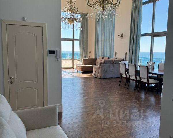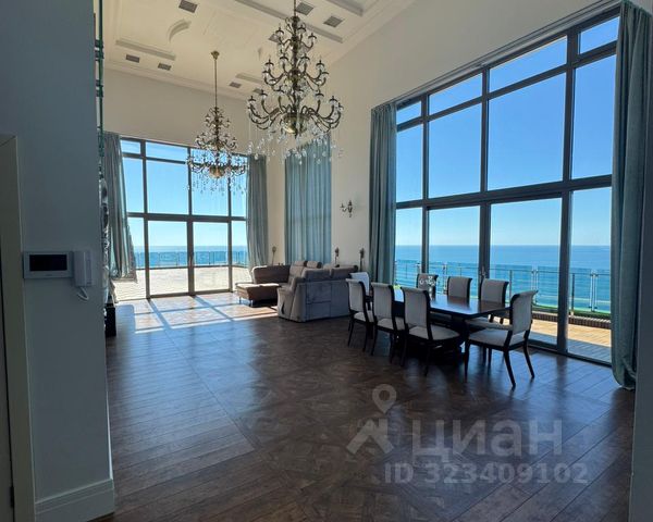 Трехэтажный ПЕНТХАУС, находится в самом центре г. Сочи . В современном новом доме Идеал Хаус . ( в общем пользовании Бассеин , бар, открытые зоны ). В комплексе есть все , что нужно: рестораны , магазины , кафе, клиника , детский сад, спорт зал . Пентхаус расположен на последних двух этажах ( 17 и 18). Шикарный вид начинается с захода в лифт На первом этаже Пентхауса находится гардеробная ( 8 м 2), душевая - постирочная - туалет , кухня 20 м 2, гостиная 80 м 2 , высота потолка 5.60 м . Три выхода на террасу . Полное остекленение . Терраса 182,7 м 2. Второй этаж : 4 отдельные спальни , на этаже одна центральная ванная комната ( ванная , унитаз , раковина ). В двух спальнях отдельные ванные комнаты . В холле второго этажа находится вместительный встроенный шкаф для хранения . Терраса 70,2 м 2. Отдельные два выхода на террасу второго этажа и террасу первого этажа. На третьем этаже находится род спальня 35 м 2, с шикарным видом на море ! Отдельная гардеробная и ванная комната со всеми удобствами . Косметический ремонт был сделан 4 мес назад . Выложена новая терраса . Квартира оснащена и оборудована новой Американской мебелью и бытовой техникой . Объект находиться под охраной и видео наблюдением .