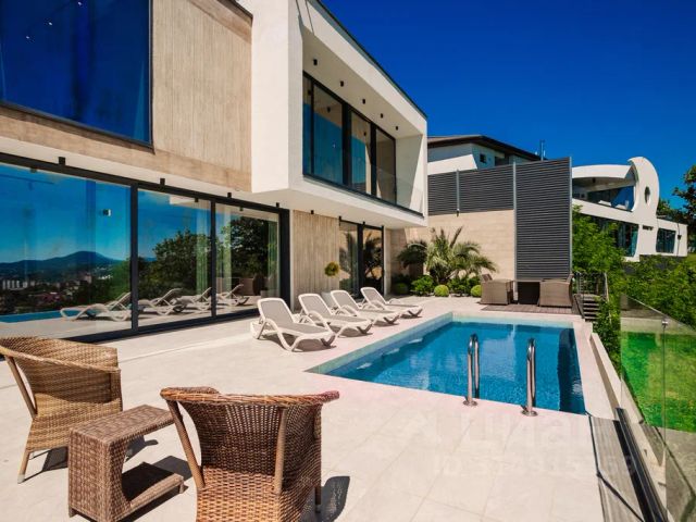 Большой красивый деревянный дом с стиле шале. В доме: Красивый бассейн под открытым небом (бассейн с подогревом) , терраса для загара, зона барбекью, настоящая русская баня, дровяной камин, великолепная просторная терраса с большим столом для праздников, выдержанный стильный интерьер всех помещений, несколько отдельных комнат, 4 сан. Узла, просторная кухня, большие панорамные окна и захватывающий вид на горы! Дом рассчитан на максимальное количество гостей: 13 человек. Близко к центру, хорошая дорога, инфраструктура, при этом уединенно, нет соседей, машин и т. д. Безопасно, уделяем особое внимание дезинфекции и чистоте. Волшебное, уединенное место для вашего отдыха, и всего в 20 минутах от центра!