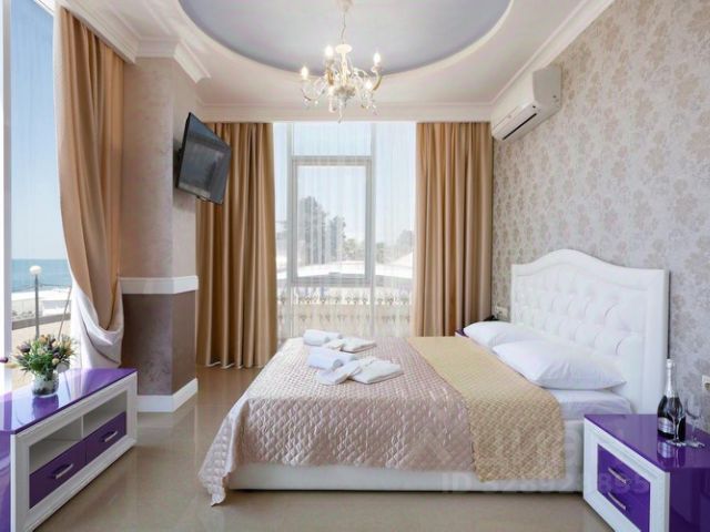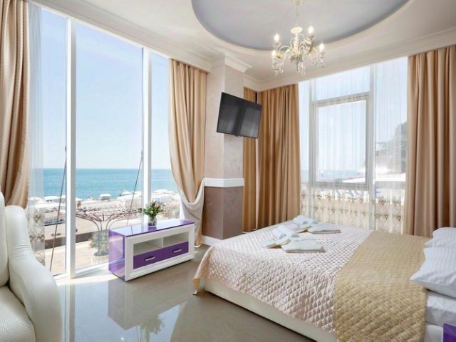 Двухместные номера с видом на море с одной двуспальной или двумя односпальными кроватями расположены на втором, третьем и четвертом этажах современные однокомнатные номера с выходом на балкон и видом на море. В номерах есть все необходимое для комфортного отдыха. Удобные кровати и высококачественное постельное бельё гарантируют вам полноценный отдых после прогулок, экскурсий и походов на пляж. Кондиционер создаст приятную прохладу в жаркие летние дни, а система отопления согреет после катания на горнолыжных склонах. В номере есть туалетный стол, большое зеркало, чайный набор, шкаф, фен, холодильник и ЖК телевизор. Индивидуальный санузел оборудован душем. В стоимость номера входит бесплатный Wi-Fi. К вашим услугам в отеле есть собственная столовая, а также кухня для самостоятельного приготовления пищи и лаундж с панорамным видом на море на пятом этаже.