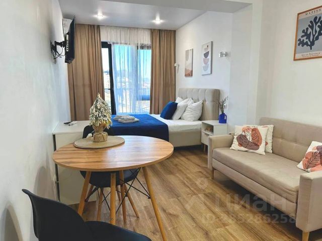 В зале расположены диваны и двухспальная. Компактная мини-кухня с мойкой, барной стойкой для приготовления еды и напитков.