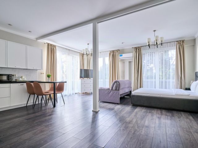 Отель IL Punto предлагает своим гостям уникальную атмосферу, где сочетаются стиль, уют и комфортный отдых. Это не просто место для ночлега — это пространство, которое вдохновляет и создает идеальные условия для незабываемых впечатлений. Апартаменты, от студий до люксов, оснащены балконом или террасой с потрясающими видами на море, парк или город, что позволяет вам наслаждаться красотой Сочи прямо из вашего номера. Здесь каждый момент становится особенной частью вашего путешествия. Отель находится на знаменитом Курортном проспекте — одной из главных артерий Сочи, где всё, что вам нужно для отличного отдыха, расположено в шаговой доступности. Близость Морского вокзала и набережной позволяет наслаждаться прогулками вдоль морского побережья в любое время суток. Остановившись у нас, вы окажетесь в самом сердце городской жизни, где каждый уголок пронизан атмосферой веселья и радости. Насладитесь уникальным сочинским колоритом и впечатлениями, которые запомнятся на всю жизнь. Это идеальная отправная точка для знакомства с городом. Наши апартаменты с кухонной зоной — идеальный выбор как для семейного отдыха, так и для деловых поездок. Мы создаем комфортную обстановку, сочетающую уют дома и удобство. Кухонная зона оборудована микроволновой печью и набором посуды. Наслаждайтесь домашним комфортом даже в путешествии — будь то с семьей или в командировке! Для гостей, предпочитающих планировать свой отдых заранее, доступна опция предварительного выбора варианта завтрака при бронировании номера по тарифу. "Люкс с террасой и видом на город и море" — это номер для тех, кто ищет больше, чем просто комфорт. Панорамные окна заливают комнату мягким светом, а просторная терраса дарит удивительные виды на море и парк. Просторная гостиная с кухонной зоной создает все условия для уютного отдыха, а функциональный дизайн делает ваше пребывание еще комфортнее. В номере предусмотрено всё необходимое для вашего удобства: двуспальный диван, микроволновая печь и стиральная машина. Ежедневно в номере доступны пакетированный чай (чёрный, зелёный) и сахар. *Кровати в номере имеют фиксированную конструкцию и не могут быть трансформированы в односпальные. *Обращаем ваше внимание, что в настоящее время варочные поверхности в номерах временно не функционируют.