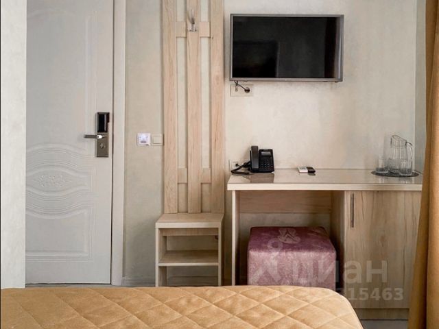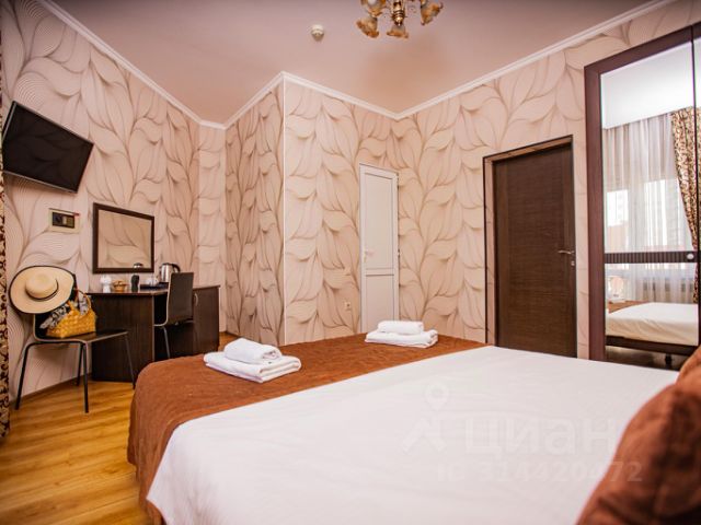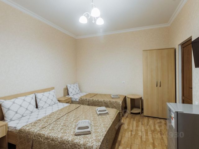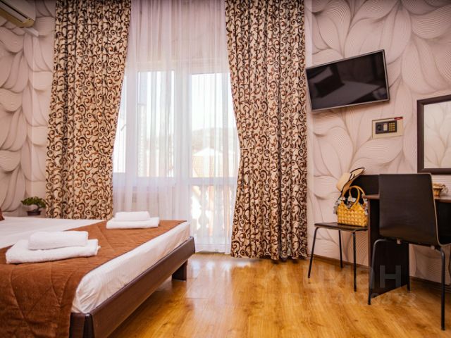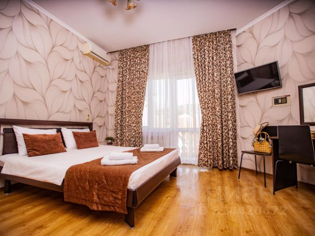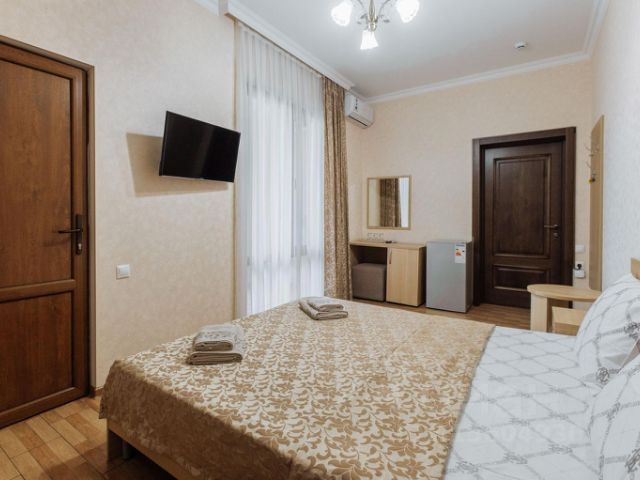 Уютный однокомнатный номер 35 кв. м. на 5 мансардном этаже. В номере: 1 двуспальная кровать, 2 односпальные кровати, трюмо, журнальный стол, набор посуды, стулья, кабельное ТВ, шкаф-купе, холодильник, кондиционер. Ванная комната с душем. Вид на внутренний двор, бассейн, море, горы. Рядом с номером находится обзорная площадка - отрытая терраса с прямым видом на море (для гостей доступна пляжная мебель: стол, кресла, лежаки).
