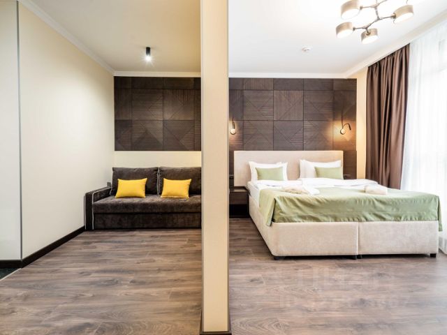 Отель в 420 м от канатной дороги "Лаура". Через дорогу находится кинотеатр "Звездный" и развлекательный центр "Галактика". До крепости Ачипсе прогулка занимает 10 минут. Канатная дорога "Красная Поляна", ТЦ "Горки Молл", парк "Времена года" расположены в 2 км, казино "Сочи", Red Arena и дом-музей А.Х. Таммсааре — в 3 км. Ратуша, пляж Rosa Beach и музей "Моя Россия" — также в 3 км. Расстояние до ж/д вокзала Роза Хутор составляет 2 км, до аэропорта Сочи — 51 км. Гости могут забронировать номера категорий: Стандарт, Улучшенный, Улучшенный Семейный. Все они оснащены шкафом, телевизором, столиком, Wi-Fi, холодильником, кофемашиной и ванной комнатой. Имеются номера с террасой или балконом. Гостям предоставляются полотенца, тапочки, халаты и косметические принадлежности. Питание гостей осуществляется в ресторане. На территории отеля имеется комната для сушки и хранения горнолыжного оборудования, а также пункт проката. К услугам гостей сауна и парковка. Общая площадь - 33 квадратных метра! Отлично для семьи с детьми. Номер оборудован двуспальной кроватью (трансформер), есть телевизор с плоским экраном и спутниковым ТВ. Ванная комната с полноценной ванной, феном, косметическими принадлежностями. Дополнительное место - просторный двуспальный диван. Чудесный вид на горы, либо вид в сторону лесного склона - очень романтично. Номера расположены на 4 этаже нашего отеля. Большая площадь, балкон, всё необходимое для Вашего комфорта. Будьте ближе к природе!