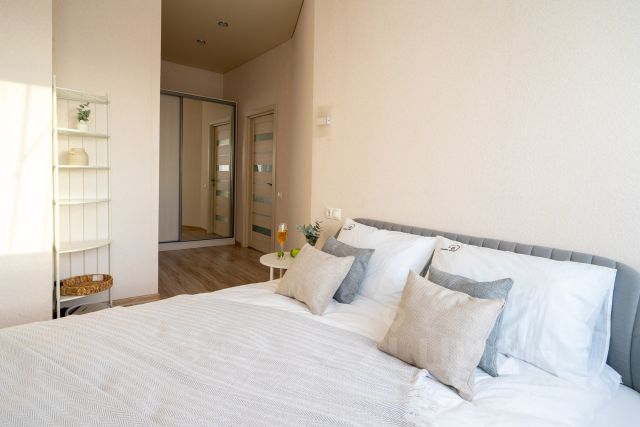 Широкую двухспальную кровать с ортопедическим матрасом и чистым постельным бельем для крепкого сна, большой вместительный шкаф-купе с зеркалами напротив кровати.