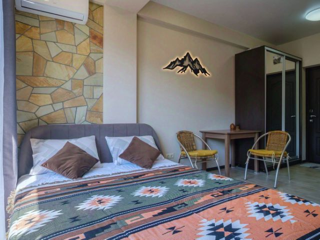 Дом-шале "Музыка реки" расположен на высоком берегу речки Бешенка в центре Красной Поляны. Квартира занимает весь первый этаж дома. Из панорамных окон и открытой лоджии-террасы открывается красивый вид на горный хребет и кругозор Ефремова, который абсолютно ничего не загораживает. Под окнами шумит горная речка, поют птицы. 3 отдельные спальни, каждая со своим санузлом, в том числе один санузел с ванной и кедровой бочкой! Комфортные двуспальные кровати готовы разместить по 2 гостя (общее количество гостей до 6 человек). Дети до 3-х лет размещаются бесплатно с родителями на имеющихся спальных местах. Дети старше 3-х лет размещаются как взрослые. Одна детская кровать предоставляется по запросу. В каждой спальне оборудованы просторные шкафы, письменные столы из натурального массива дерева. Сердцем квартиры является большая гостиная-столовая с живым камином. Стол из натуральных материалов (мрамор и массив бука) соберет большую семью за вкусным обедом. В квартире имеется все необходимое для комфортного проживания: Полностью оборудованная всем необходимым кухня: кофемашина, посудомоечная машина, варочная поверхность 4 конфорки,тостер, духовка, современная посуда и столовые приборы; Живой камин на дровах; быстрый интернет Wi-Fi; Smart TV 65"; Стирально-сушильная машина-автомат; Фены в каждой ванной комнате; В ванной комнате установлена кедровая бочка; Утюг и гладильная доска; Полотенца и ванные принадлежности; Постельное белье и ортопедические матрасы; Теплый пол по всей площади квартиры; Приточно-вытяжная вентиляция; Кондиционер и потолочные вентиляторы. Отдельная комната для сушки горнолыжной одежды и обуви. Квартира расположена в центре Красной Поляны у остановки Часовня. В 100 метрах находится 3 продуктовых сетевых магазина, рестораны, кафе и кофейни в шаговой доступности. Парковка для 1 автомобиля во дворе дома, для остальных свободная парковка вдоль улицы. Примечание к стоимости: Основной залог 15000 рублей вносится при заезде, возвращается в день выезда после уборки. При размещении с животными дополнительный залог +15000 рублей и +3000 уборка.