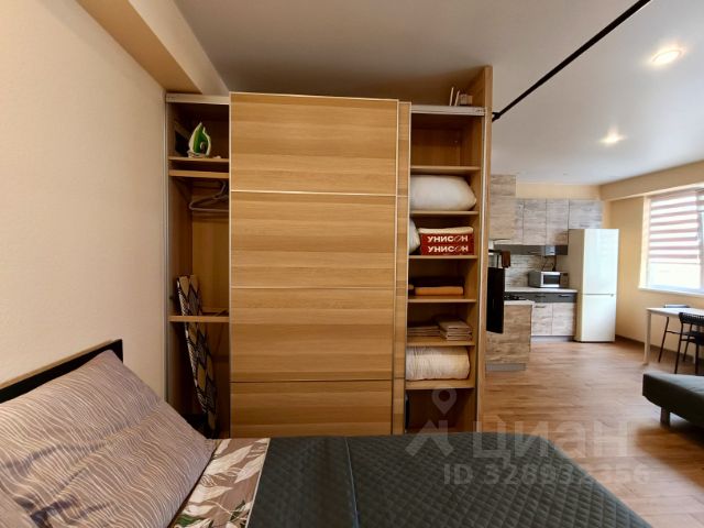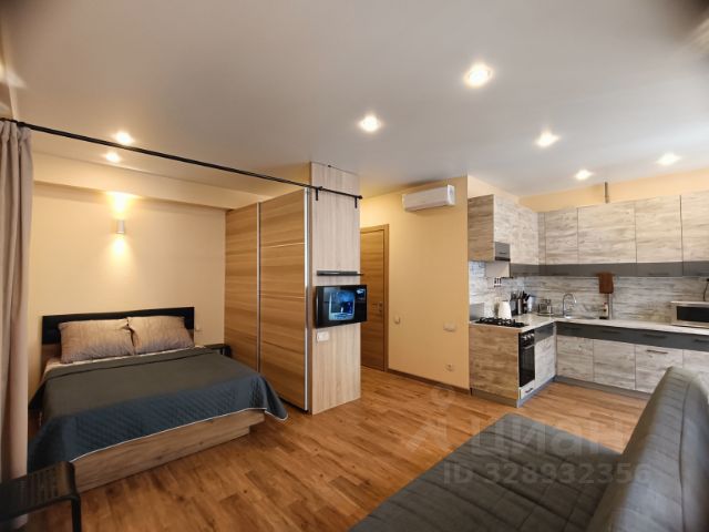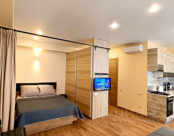 • Практичная планировка: прихожая с местами хранения, совмещенный санузел (душ), просторная кухня, зона гостиной (диван-книжка, ТВ, Wi-Fi), спальная зона (двуспальная кровать с подъемом, шкаф-купе).