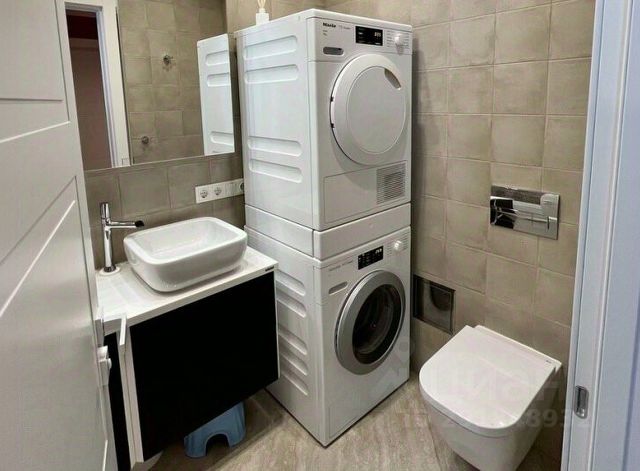 В квартире два санузла. Основной - ванная, унитаз, раковина, стиральная и сушильная машины. Туалет в мастер-спальне: душевая, унитаз, раковина.